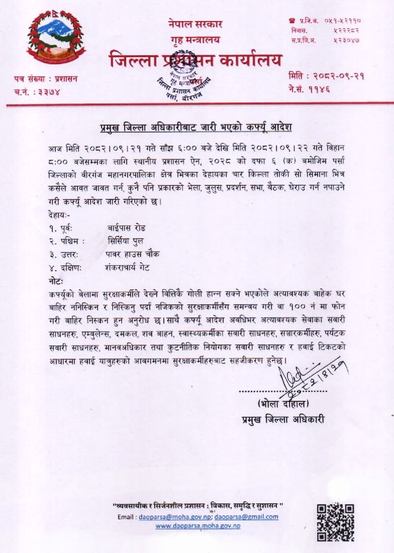 वीरगञ्जमा कर्फ्यु आदेश